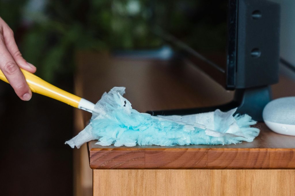 When removing dust off surfaces, using a microfibre cloth is one of the best tools. The microfibre helps to remove the tiny dust particles without the need for any cleaning product. The fibres work to create a static charge that attracts the dust, so it is easily picked up.